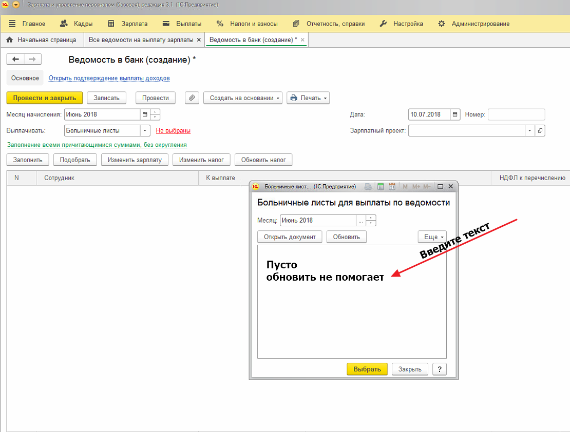 ЗУП 3.1 Не делает выплату больничного. Всё начислено и посчитано по инструкции. Делаю ведомость на выплату и не могу выбрать документ-основание больничный. Будто-нет его. Но он же есть...