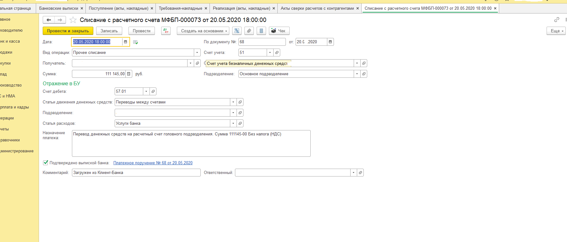 хотела уточнить, что в организации переводы между счетами головного отделения организации делаются по виду списания, как вы сказали, Перевод на другой счет по ст. ДДс Перевод между счетами,
