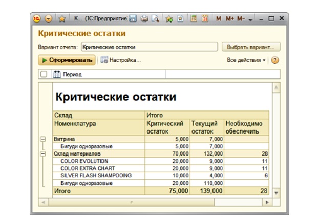 Контроль критических остатков осуществляется с помощью специального отчета, позволяющего отследить, какие материалы и товары в срочном порядке необходимо заказать у поставщика.