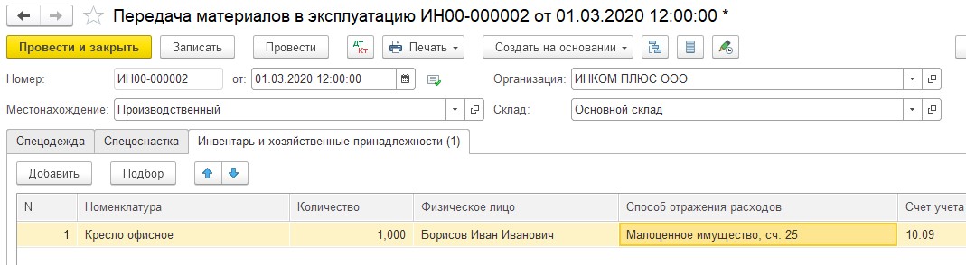 В дальнейшем при списании этого малоценного имущества необходимо оформить документ «Списание материалов из эксплуатации» (раздел «Склад» – подраздел «Спецодежда и инвентарь»).