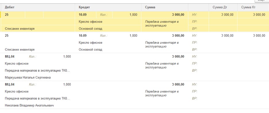 Обратите внимание, что при проведении образуется проводка по дебету забалансового счета МЦ.04 «Инвентарь и хозяйственные принадлежности в эксплуатации» (рис. 3).