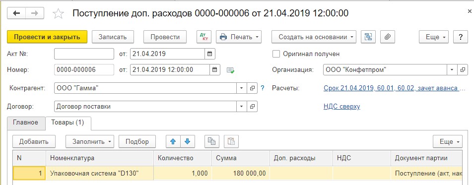 Что касается дополнительных расходов, например, доставки, то их необходимо включить в первоначальную стоимость основного средства. Такая операция оформляется документом «Поступление допрасходов» (раздел «ОС и НМА» – «Поступление оборудования») Данный документ предназначен для отражения услуг сторонних организаций, затраты на которые включаются в стоимость товаров. На закладке «Главное» необходимо отразить сумму расходов, а на закладке «Товары» указать сам приобретаемый актив (рис.5).