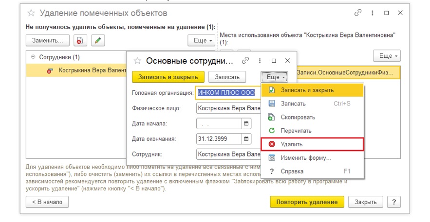 - Какие настройки в программе «1С:Зарплата и управление персоналом 8» необходимо выполнить, чтобы из среднего заработка сотрудников исключались суммы оплачиваемых нерабочих дней? – В том случае, если предприятие в период пандемии не осуществляло свою деятельность, но выплачивало сотрудникам суммы, как в обычные рабочие дни, то есть сохраняло за ними их заработок, то в соответствии с Письмом Минтруда РФ от 18.05.2020 № 14-1/в-585, эти суммы могут не учитываться в среднем заработке. Для того чтобы в программе «1С:Зарплата и управление персоналом 8» суммы оплачиваемых нерабочих дней были исключены из расчета среднего заработка, следует выполнить ряд условий. Во-первых, изначально необходимо проверить «Графики работы сотрудников» (раздел «Настройка» – блок «Предприятие»), где в период оплачиваемых нерабочих дней часы должны быть проставлены во второй строке месяца. Рис.1 Также в настройках расчета зарплаты (раздел «Настройка» – «Расчет зарплаты») должна быть снята галка «Учитывать оплачиваемое нерабочее время и суммы в среднем заработке». После этого необходимо обновить данные для расчета среднего заработка (раздел «Зарплата» – блок «Сервис») за период, когда за сотрудниками сохранялся их заработок. Причем, исключение сумм оплачиваемых рабочих дней действует только за те периоды, которые определены на федеральном уровне: с 30.03.2020 по 03.04.2020 (Указ Президента РФ от 25.03.2020 № 206); с 04.04.2020 по 30.04.2020 (Указ Президента РФ от 02.04.2020 № 239); с 06.05.2020 по 08.05.2020 (Указ Президента РФ от 28.04.2020 № 294); 24.06.2020 (Указ Президента РФ от 29.05.2020 № 345); 01.07.2020 (Указ Президента РФ от 29.05.2020 № 354). В том случае, если предприятие не работало в другие периоды, то средний заработок за данные месяцы корректируется вручную. – Как в программе «1С:Зарплата и управление персоналом 8» удалить объект, если возникает ошибка, связанная с тем, что документ используется в перечне регистров? – Зачастую при удалении объектов в программе может возникнуть ошибка, что объект, помеченный на удаление невозможно удалить из-за того, что обнаружены места его использования. В том случае, если местом использования является какой-либо документ в базе, то изначально необходимо удалить его. Если же программа ссылается на регистры, то, чтобы удалить их, следует двойным нажатием мыши провалиться в соответствующий регистр и воспользовавшись командой «Еще» в правом верхнем и в открывшемся списке выбрать «Удалить». После чего повторить удаление основного объекта. Рис.2 – Как отправить Реестр сведений, необходимых для назначения и выплаты пособий, если возникает ошибка «Дата выдачи больничного листа не совпадает с датой начала временной нетрудоспособности»? – Согласно п. 14 Приказа Минздравсоцразвития России от 29.06.2011 № 624н, при заболеваниях, профессиональных заболеваниях (травмах, в том числе полученных вследствие несчастного случая на производстве), когда лечение осуществляется в амбулаторно-поликлинических условиях, листок нетрудоспособности выдается в день установления временной нетрудоспособности на весь период временной нетрудоспособности, включая нерабочие праздничные и выходные дни. В связи с этим для того, чтобы отправить реестр в ФСС, необходимо, чтобы дата выдачи листка нетрудоспособности и начала больничного совпадали. Для этого в Реестре сведений, необходимых для назначения и выплаты посо