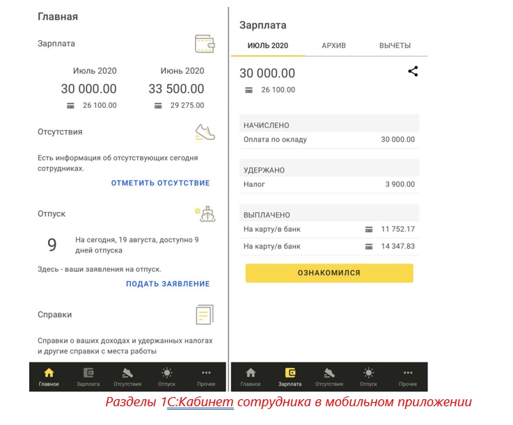 Программа «1С:Кабинет сотрудника» позволяет передавать все необходимые данные (справки, расчетные листки и другую информацию) напрямую из приложений «1С:Зарплата и управление персоналом 8» и «1С:Зарплата и кадры государственного учреждения 8». Дает возможность просматривать данные сотрудников через компьютер, сайт или специальное приложение для планшета и мобильных устройств (iOS и Android).