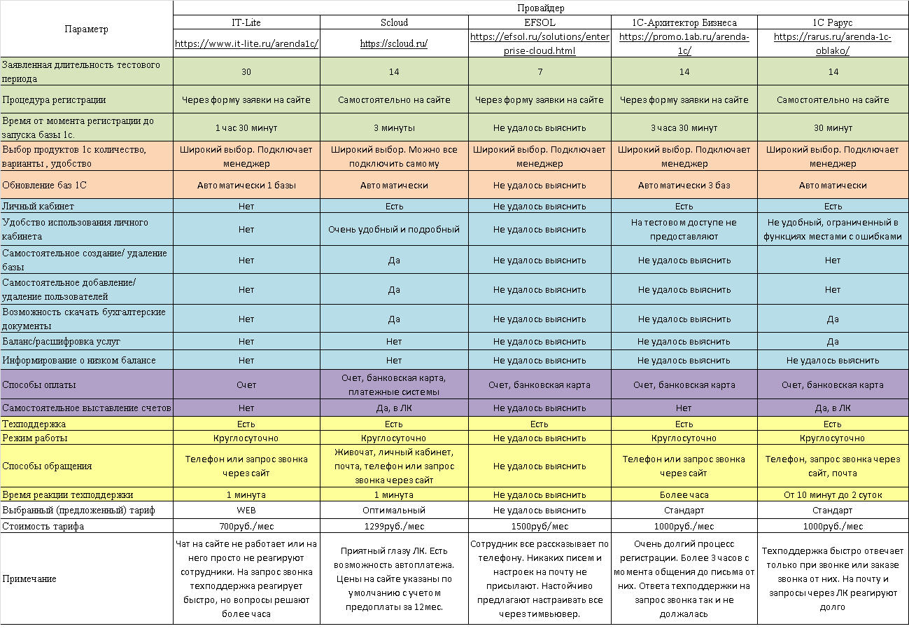 Вариант удобный, тем более что многие из таких компаний, обещали еще и сокращение затрат. Поисковик «Яндекс» по запросу «аренда 1С в облаке» выдал большой список поставщиков и, мне предстояло определиться, кого же из них выбрать. Вот кого рассматривала, в качестве возможных поставщиков и, мнением о которых, хочу поделиться с вами: 1. IT-Lite; 2. Scloud; 3. EFSOL; 4. 1С-Архитектор Бизнеса; 5. 1С Рарус; 6. Аренда 1С; 7. ArCloud; 8. IT'S Cloud; 9. 1 БИТ; 10. Landcloud. При беглом осмотре сайтов и предложений, все казалось примерно одинаковым. Хорошо, что все поставщики предлагают бесплатный ознакомительный доступ и можно попробовать «тест драйв», а не просто поверить рекламе или обещаниям продавца-консультанта. Я решила подойти к вопросу основательно и составить список основных интересующих меня характеристик. Это удобство регистрации и использования, оплаты и наличие линии поддержки (технической и консультационной). Постаралась подробно рассказать о каждом рассмотренном мною поставщике, но если где-то получилось немного – значит, о них совсем нечего сказать. Не отличились ни чем-то хорошим, ни плохим. С полным списком вы можете ознакомиться в таблицах, а пока о каждом поставщике чуть подробнее. 1. IT-Lite. Регистрация довольно сложная – отправляешь заявку на сайте, ждешь пока тебе позвонит менеджер, выяснит интересующие тебя вопросы или ответит на твои и предоставит доступ. У меня от момента регистрации, до входа в 1С ушло почти полтора часа. Личного кабинета не нашла или его нет. По сути, даются различные варианты входа в программу (WEB, RDP, тонкий клиент), а дальше все через менеджера и техподдержку. Кстати, на мой вопрос, заданный через чат на сайте никто не ответил. Попросила мне перезвонить, есть и такая функция на сайте. Перезвонили сразу, но вопрос в итоге решали более часа. 2. Scloud. Процесс регистрации прост и понятен. Заходишь на сайт, оставляешь свои данные. Через пару минут у тебя уже есть доступ и к личному кабинету и новой, пустой базе. К слову сказать, личный кабинет многофункционален. В нем можно самостоятельно добавить или удалить пользователя, базу свою загрузить, счет на оплату услуг заказать. Единственное, что омрачило мое впечатление – это уловка с ценами. На сайте они указаны с учетом предоплаты за год, а без нее разница 200руб/мес. Да и менеджер настойчиво уговаривает подключаться на самый дорогой тариф с «кучей» всяких функций, которые мне, по сути, не были нужны. 3. EFSOL. Уж не знаю политика ли это компании или решение самого менеджера, но предоставить мне доступ могли, только подключившись к моему ноуту. Регистрация у них тоже только через заявку на сайте. После нее звонит менеджер, все очень подробно и понятно рассказывает. Рассказывает так, что уже хочется попробовать, но после того, как он предлагает «залезть» в мой компьютер и все установить, желание пропадает. Другого варианта подключения менеджер, который со мной общался, не предложил. 4. 1С-Архитектор Бизнеса. Здесь процесс регистрации через заявку. Чат на сайте ночью не работает. Оставляла заявку, чтобы мне перезвонили – так и не дождалась звонка. Днем оставила тот же вопрос в чате – примерно через час мне ответили. Менеджеры по продажам работают явно лучше техподдержки. Через 10-15 минут после регистрации мне перезвонил парень и подробно рассказал о сервисе, а вот доступ пришлось ждать более 3 часов. 5. 1С Рарус. Ре