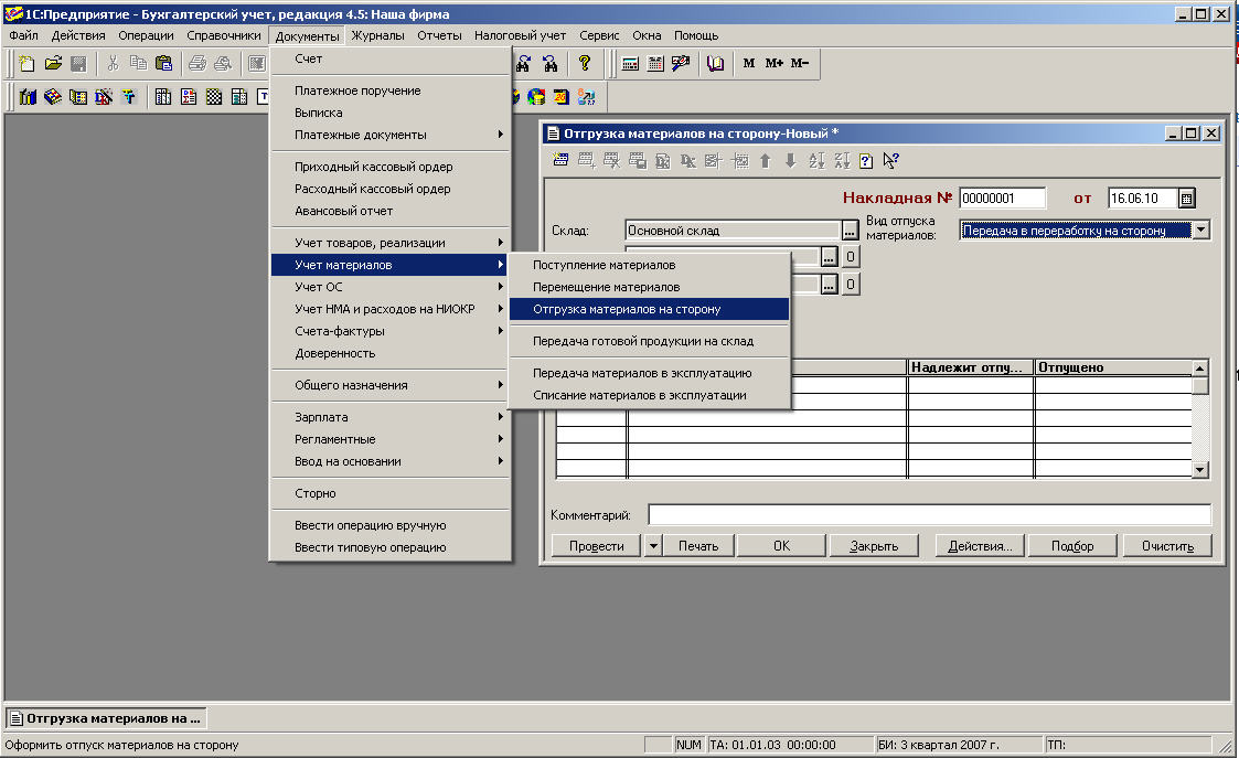 Добрый день, уважаемые форумчане! Подскажите пожалуйста какими документами и в 1С7.7. оформить передачу Подрядчику материалов, для изготовления им для нас оборудования(по договору). Материалы приобретает Заказчик (мы) за свой счет. Заранее признательна за помощь.
