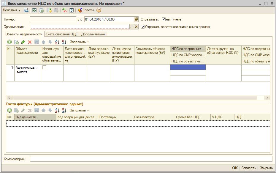 Восстановление НДС по объектам недвижимости. Делаем это вручную, т.к. счета фактуры не вводились в текущем периоде.