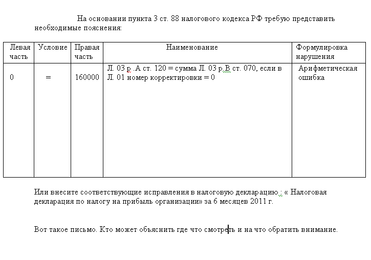 Смысл такой что : таблица с графами , где "левая часть 0","Условие =", "правая часть 164700","наименование Л.03 р.А ст 120=сумма Л 03 р.В ст.070,если в Л.01 номер корректировки =0"," Формулировка нарушения :арифметическая ошибка" Я так понял что сумма в листе 03 строке 120 должна ровняться сумме в строке 070 . Но оно и так ровно 164700. И где левая и правая часть в нал. декларации ? Надеюсь немного понятно написал. Если честно я не супер бухг. а простой вечный студент. Помогите понять где арифм. ошибка ?