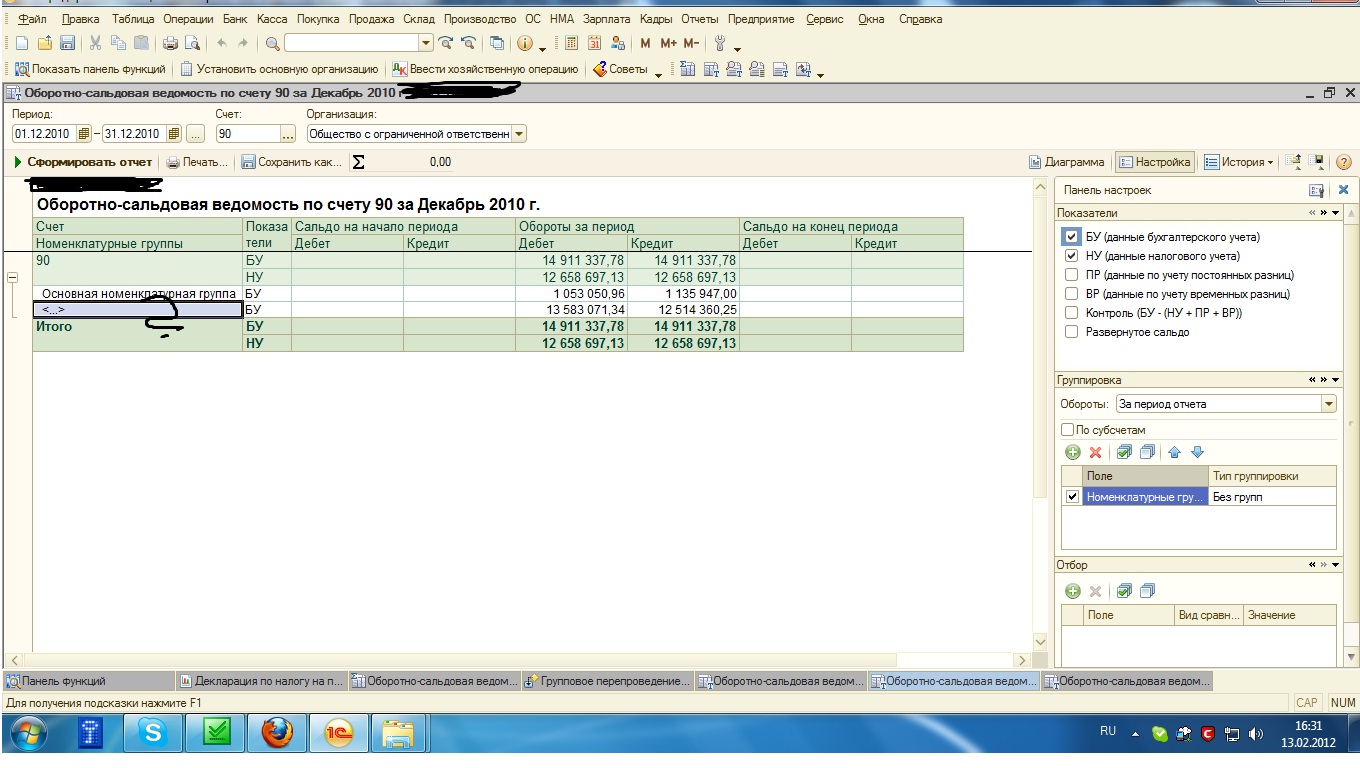 Уважаемые форумчане,не могу понять где у меня зарыта" ошибка.Программа 1С:Предприятие 8.2Бухгалтерия предприятия, редакция 2.0 (2.0.32.4) в декларацию по налогу на прибыль в стр 010 попадают только списание материалов, а остальное все уходит в косвенные, хотя в ОСБ все верно. Надеюсь очень на Вашу помощь. Спасибо. |