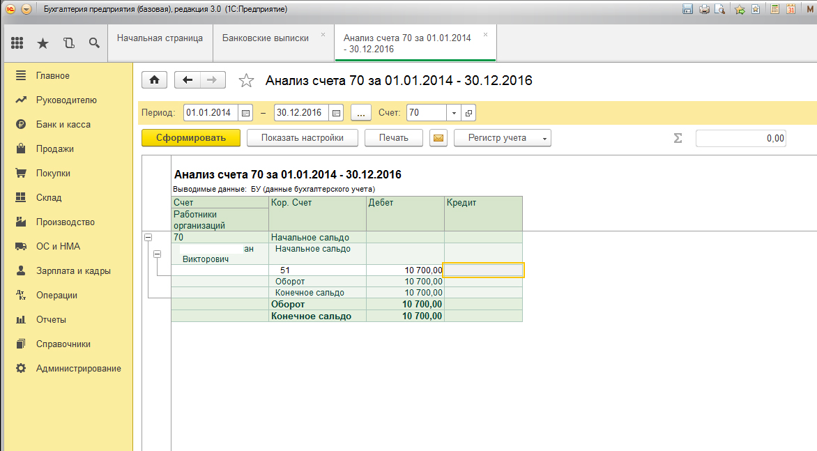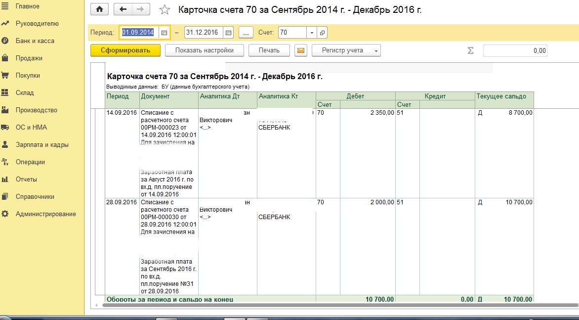1. Фото Кадровый учёт - Сотрудники пусто, после синхронизация 2 и 3 фото аналитика счёта 70, сотрудник есть 4 и 5 фото отражение зарплаты и ведомости есть Вопрос, так и должго быть что в кадровом учёте нет сотрудников? Мы стали формировать отчёты, в ПФР отчет в 1с 8.3 предприятие получился, он автоматически сам перенёся из ЗУП и выписки с ним связались, нет долгов. А вот 4-ФСС нет. Он формируется в ЗУП фото 6. а в 1с 8.3 предприятие не переносится фото 7 , так же прикладываю фото 8 и 9 выписка, я не правильно выписку оформила? Или это всё одна и та же ошибка, которая тянется с кадрового учёта? |