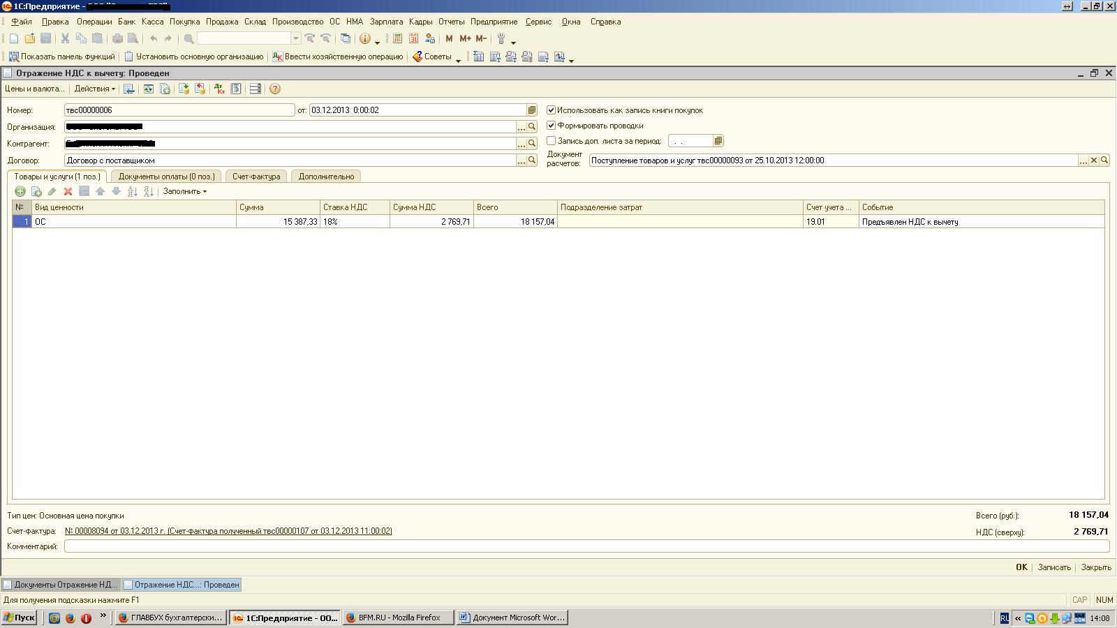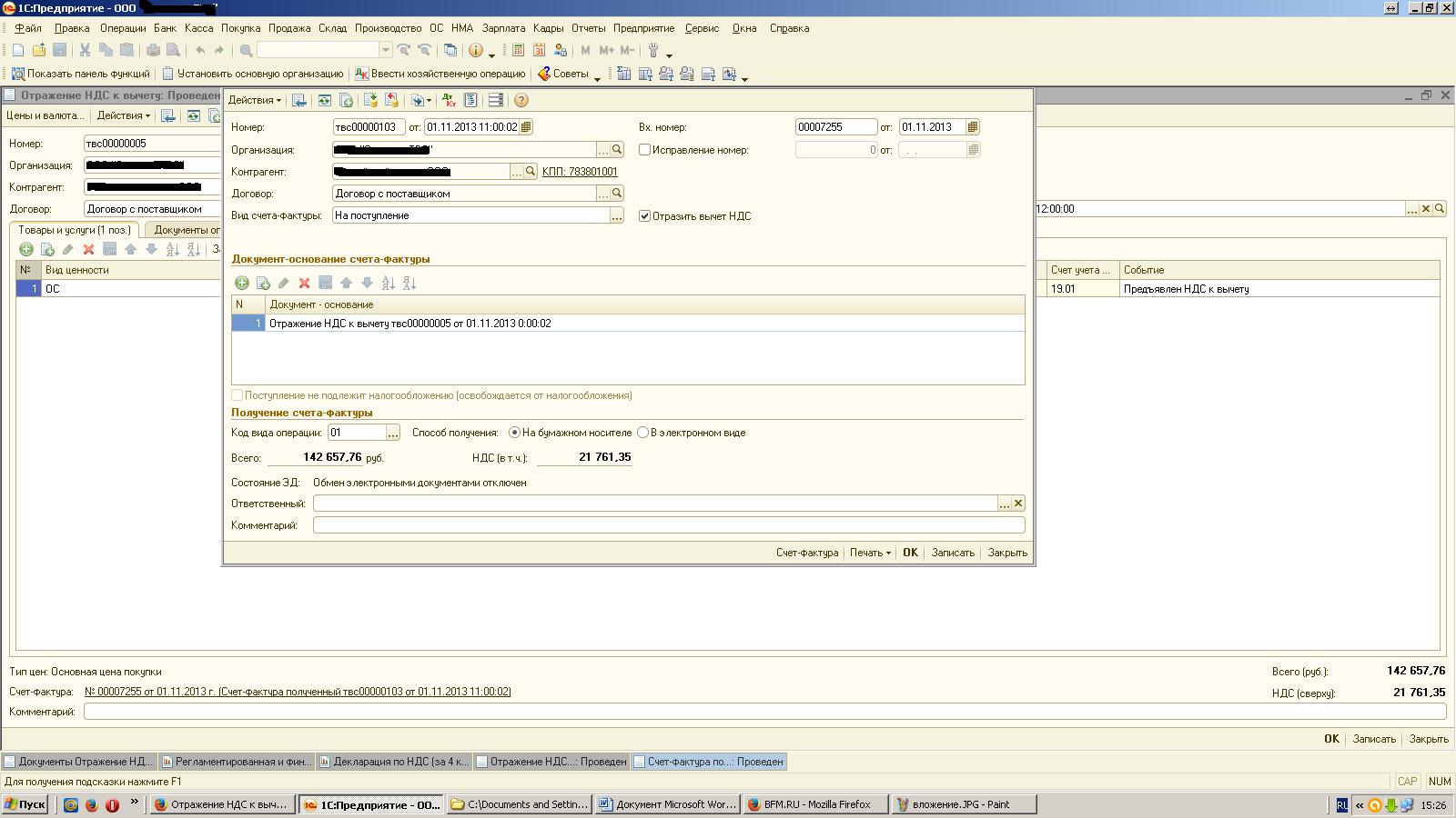 Подскажите пожалуйста, у нас счета-фактуры (по лизингу), проведенные через вкладку "Отражение НДС к вычету" не попадают в декларацию по НДС (а в книгу покупок попадает). Как это исправить? Программа: 1с8.2 (8.2.19.83) Конфигурация 2.0.55.7 Заранее спасибо. |
