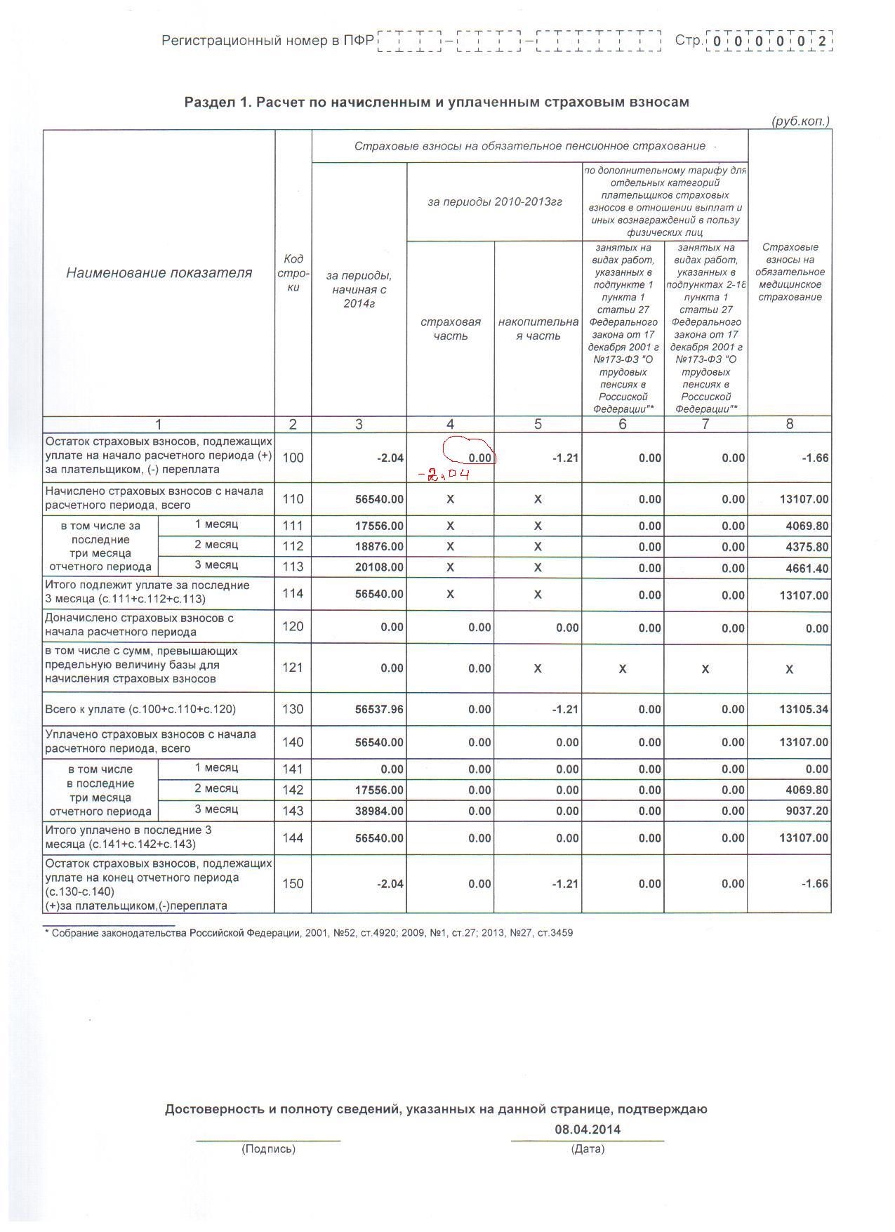 Вопрос про заполнение РСВ-1, а именно про строку 100. Имеется переплата, когда я пишу -2,04 руб. в строке 100 в графе 4, выдает ошибку. А когда это же делаю, но ставлю не в графу 4,а в 3 - все хорошо! ( как в приложенном листе отчета) Так как же все таки правильно??? Второй вариант?? И что то надо сшивать или можно степлером скрепить?? Спасибо за ранее.