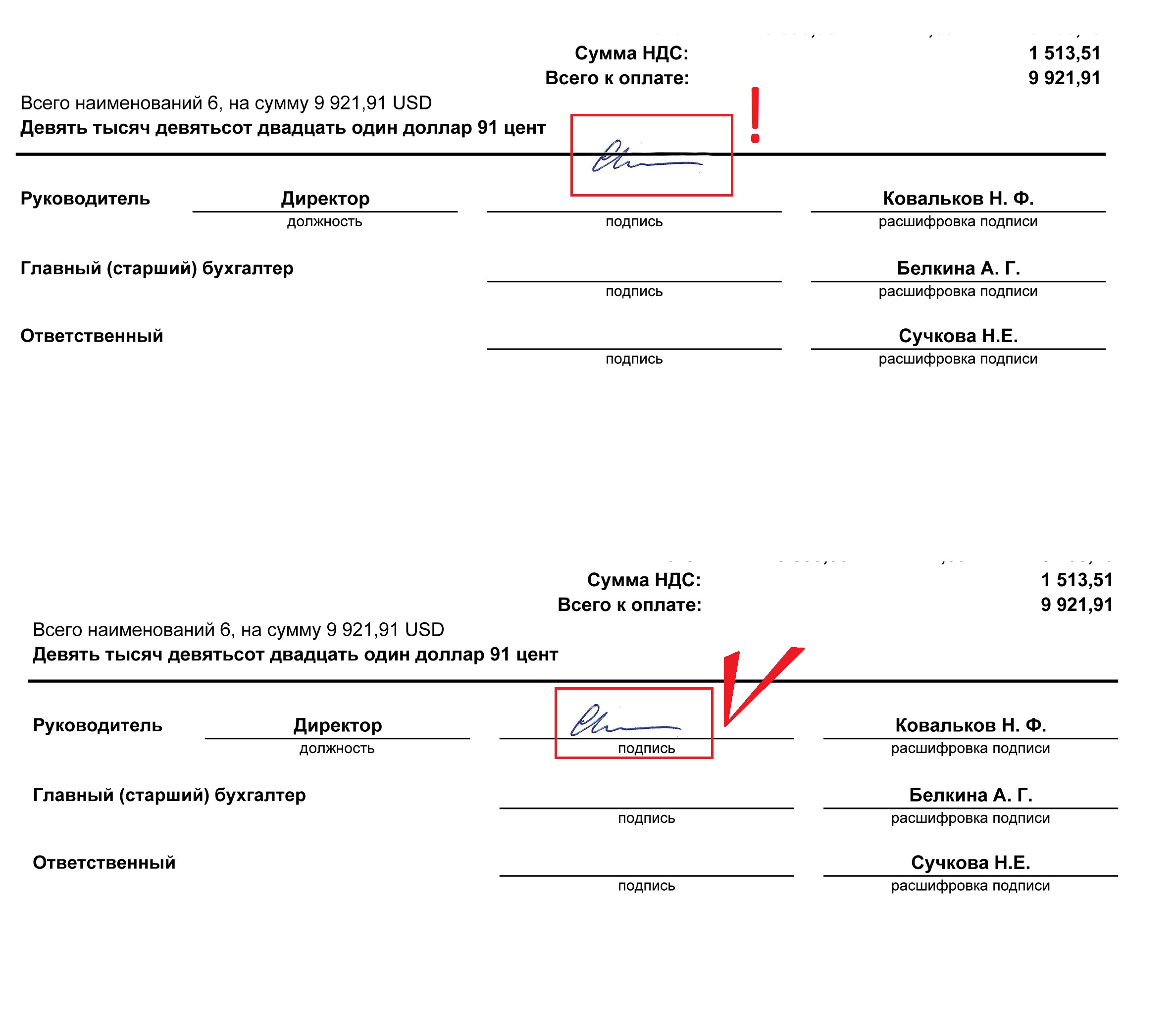 2. Отсканированный счет с подписями и печатью (формат pdf (предпочтительно) или картинки bmp, gif, jpg, jpeg. png)) ( ровно отсканированный документ, подписи не выходят за пределы области подвала счета (см. выше пример))