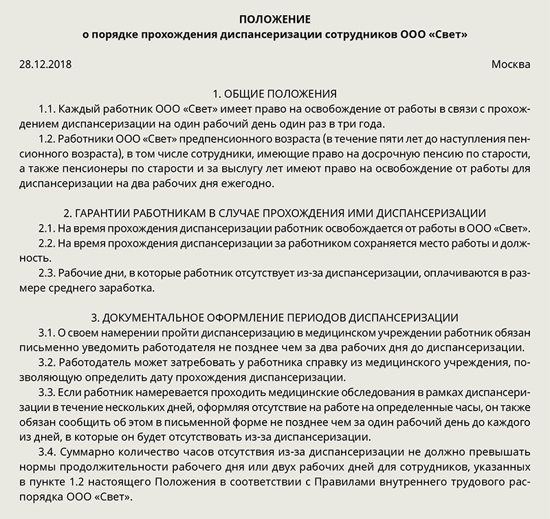 Чтобы избежать конфликтов с сотрудниками по поводу предоставления дней для медицинского осмотра, пропишите правила в положении о диспансеризации (образец ниже). Диспансеризация проходит в несколько этапов. Пациент сначала должен обратиться в поликлинику, к которой его прикрепили. Там назначат дату для диспансеризации. После этого нужно пройти саму диспансеризацию. Именно на этот этап сотруднику предоставляют освобождение от работы.