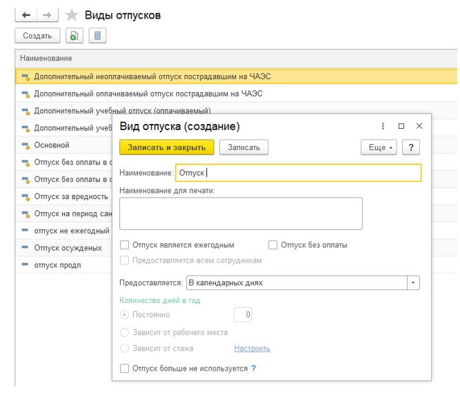 Любые другие отпуска можно создать самостоятельно, для этого необходимо зайти в раздел «Настройки» – «Виды отпусков». Для каждого отпуска вы можете установить свои персональные настройки.