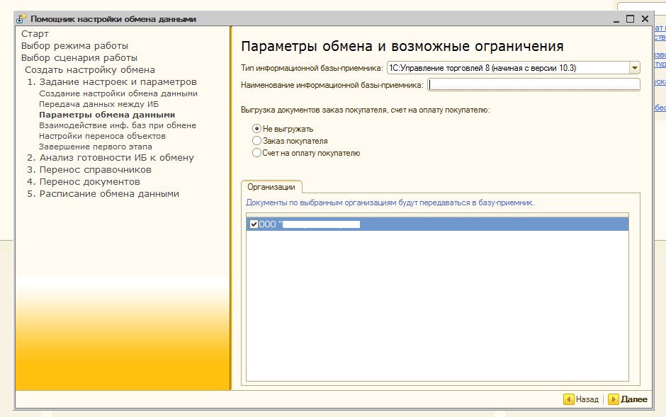 Вчера звонила программисту. Мы по телефону пробовали настроить. Насколько я поняла, проблема начинается в окошке "Параметры обмена и возможные ограничения", где надо указать "Тип информационной базы-приемника". Так вот там должно быть "Версия 11", а у меня только "1С:Управление торговлей 8 (начиная с версии 10.3)"