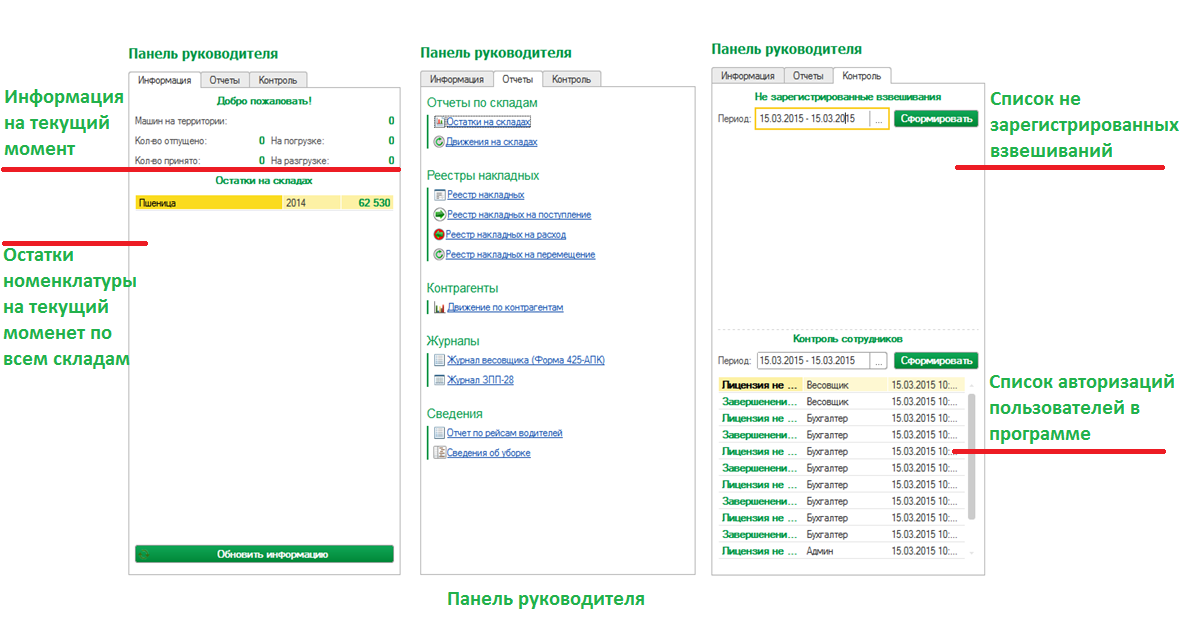 - панель руководителя - организована информационная панель для ответственных лиц которая выводит наиболее важную информацию;