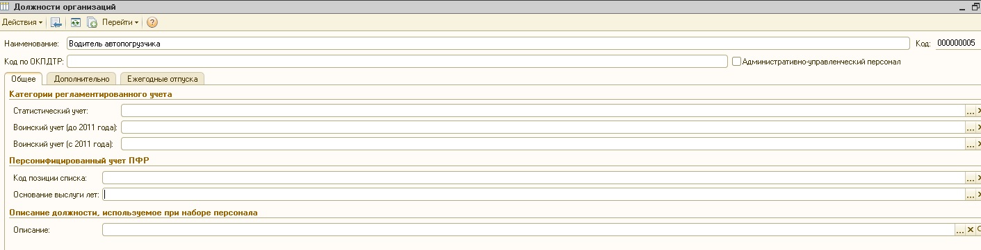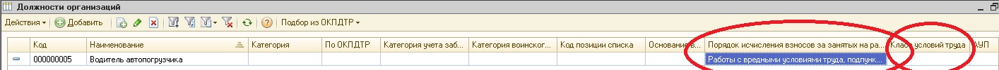 Внимательно с должностями. Если одна и та же должность фигурирует в штатном расписании в разных подразделениях, и для одной из таких позиций указаны особые условия труда (т.е. для этой должности следует установить признак обложения доп взносами), а для другой не указаны, то следует выделить для этих рабочих мест отдельные элементы в справочнике Должности и указать для них разные признаки обложения доп взносами.