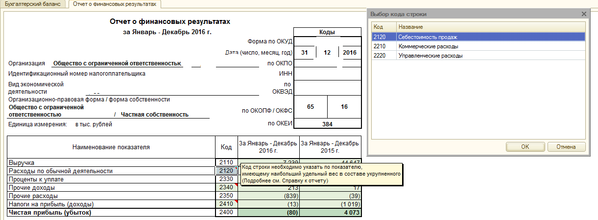 Добрый день. Заполняю отчет о финансовых результатах в программе 1с 7.7.