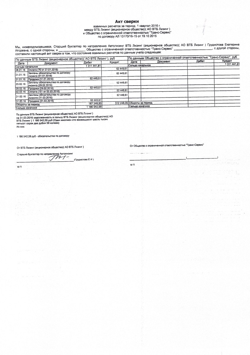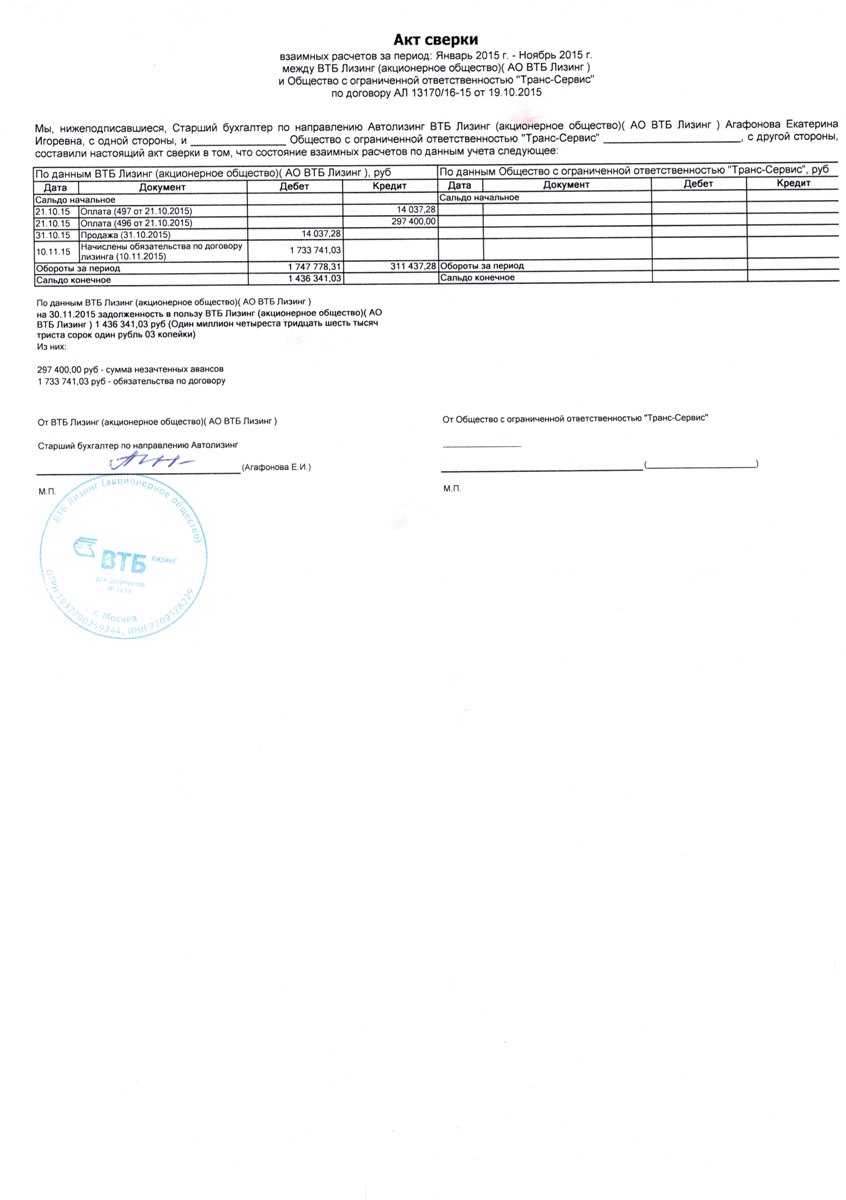 А вот сверка по договору, где у меня возникла проблема. В Акте 14037,28 это комиссия, 297400,00 предоплата, 62449,61 ежемесячный платеж, а вот 1733741,03 как раз обязательство