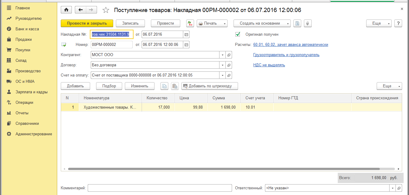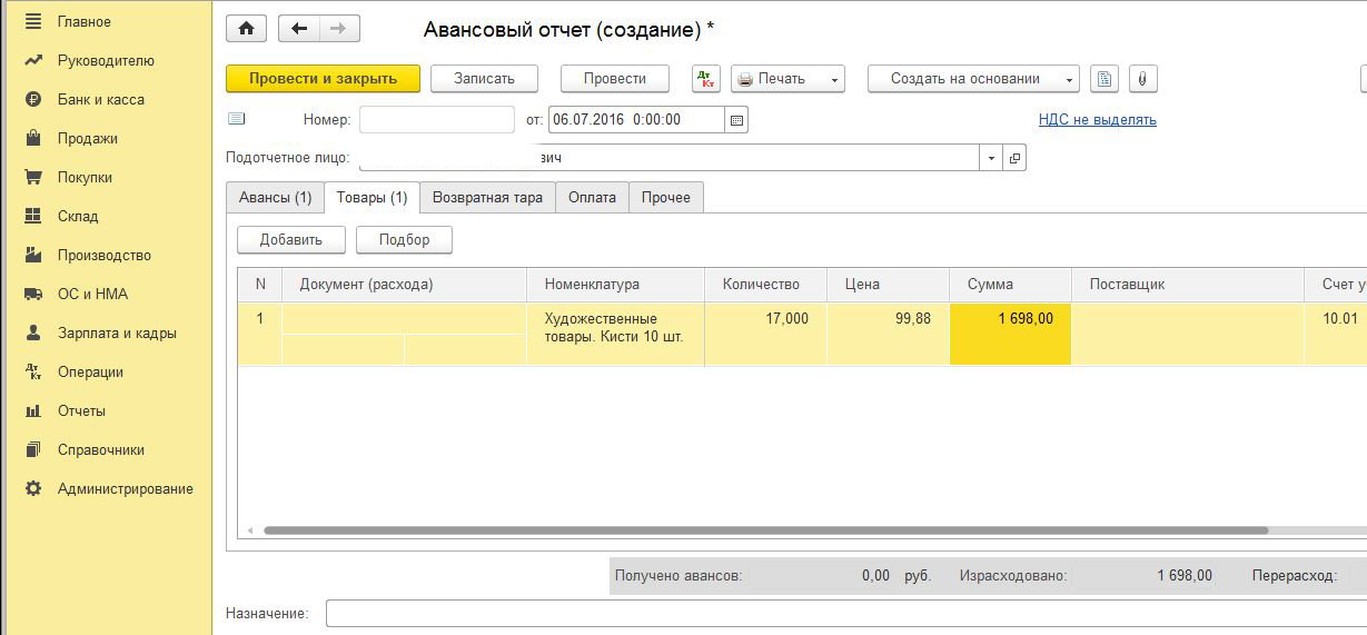 Нам нужно было в магазине передвижник купить 10 банок краски и 10 кисточек, для выполнения заказа. Счёт нам выставить не смогли, потому что нужно было выбрать через сайт. Приехать и выбрать на месте, чтобы выставили счёт, они так не делают. На сайте не было товара в наличии, который был нужен. Он был только в магазине. Кота в мешке покупать не хотелось. По этому генеральный директор поехал и сам на свои деньги купил всё. После чего на основании товарного чека деньги ему были компенсированы с расчётного счёта. Как правильно сделать проводки в программе 1С 8.3 Предприятие? Краски и кисточки нужно мне списать, обычно мне счёт выставляет поставщик. Я этот счёт оформляю в разделе " покупки, счета от поставщиков", и делаю поступление товара на основании накладной, которую мне выдал поставщик. Как правильно провести товарный чек в 1С 8.3 Предприятие? |