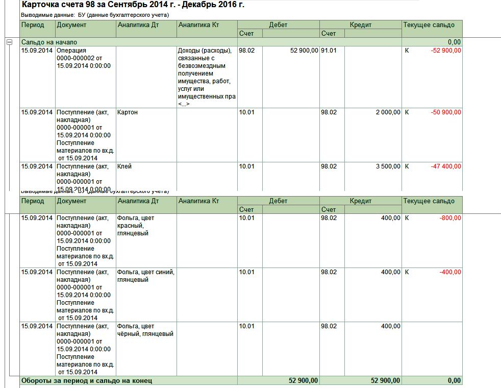 Усн 6%, доходы. Два учредителя. Программа 1С 8.3 бухгалтерия предприятие базовая. В оботно-сальдовой ведомости нет красных сумм. Но вот если зайти в карточки счетов 20, 43, 51, 98, вижу красные суммы. Помогите разобраться в чём дело. Наверно так не должно быть? Счёт 98 Данные 52 900 руб. Были переданы по договору дарения одним из учредителей. Операция вручную. Счёт 51 Скажите на 51 первом счёте вообще не может быть красных сумм? 27 руб, это налог который мы выплатили 1760 руб. выплатили в банк, я не вижу разницы между другими выплаченными платежами, почему именно эта сумма стоит красным. Счёт 20 Заполняется на основе отчёта производства за смену. Я понимаю , что должна стоять плановая цена в которую входят все расходы. Вот мы заложили 4500 руб, расходы на сумку, а продали за 8500 руб. ( если честно я так и не могу понять как программа считает …) Счёт 43 Та же сумма висит что и на 20 счёте. Буду очень благодарна если поможете понять в чём дело. С уважением, Людмила |