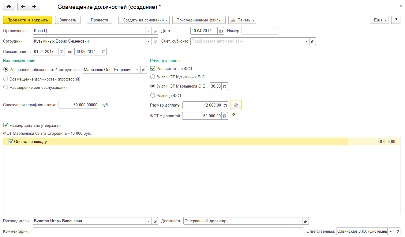 • А еще в новую редакцию разработчики добавили очень интересный документ «Совмещение должностей», которым можно назначить начисления замещающему сотруднику на основе начислений замещаемого сотрудника.