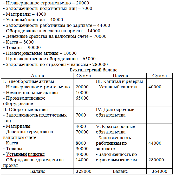 Если сложить все позиции баланса и разделить пополам, то мы должны получить валюту баланса - в нашем случае она должна быть равна 326000. Однако у вас только по трем бесспорным позициям пассива (уставный капитал и задолженности) получается больше - 364000. Значит, в условиях задачи недостает каких-то статей актива.