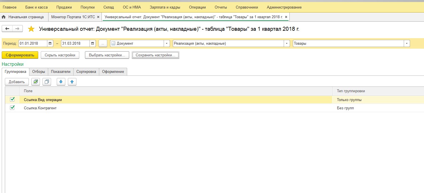 Вот. Есть ещё другой Универсальный отчёт: Администрирование – Печатные формы, отчёты и обработки – Универсальный отчёт тот сразу с Итогами. И там масса настроек..., короче, надо изучать.