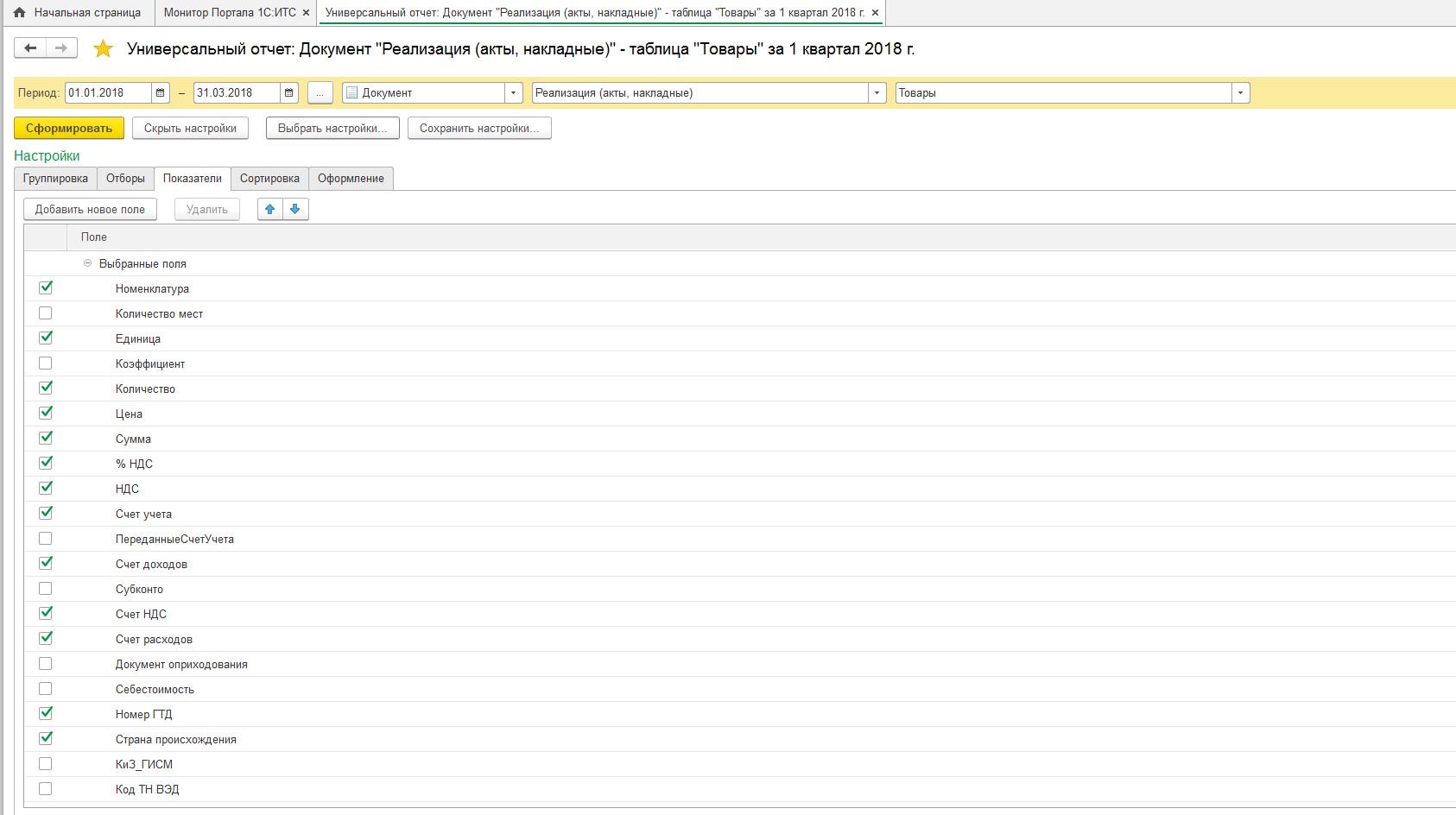 Показатели: выбраны галочками из списка