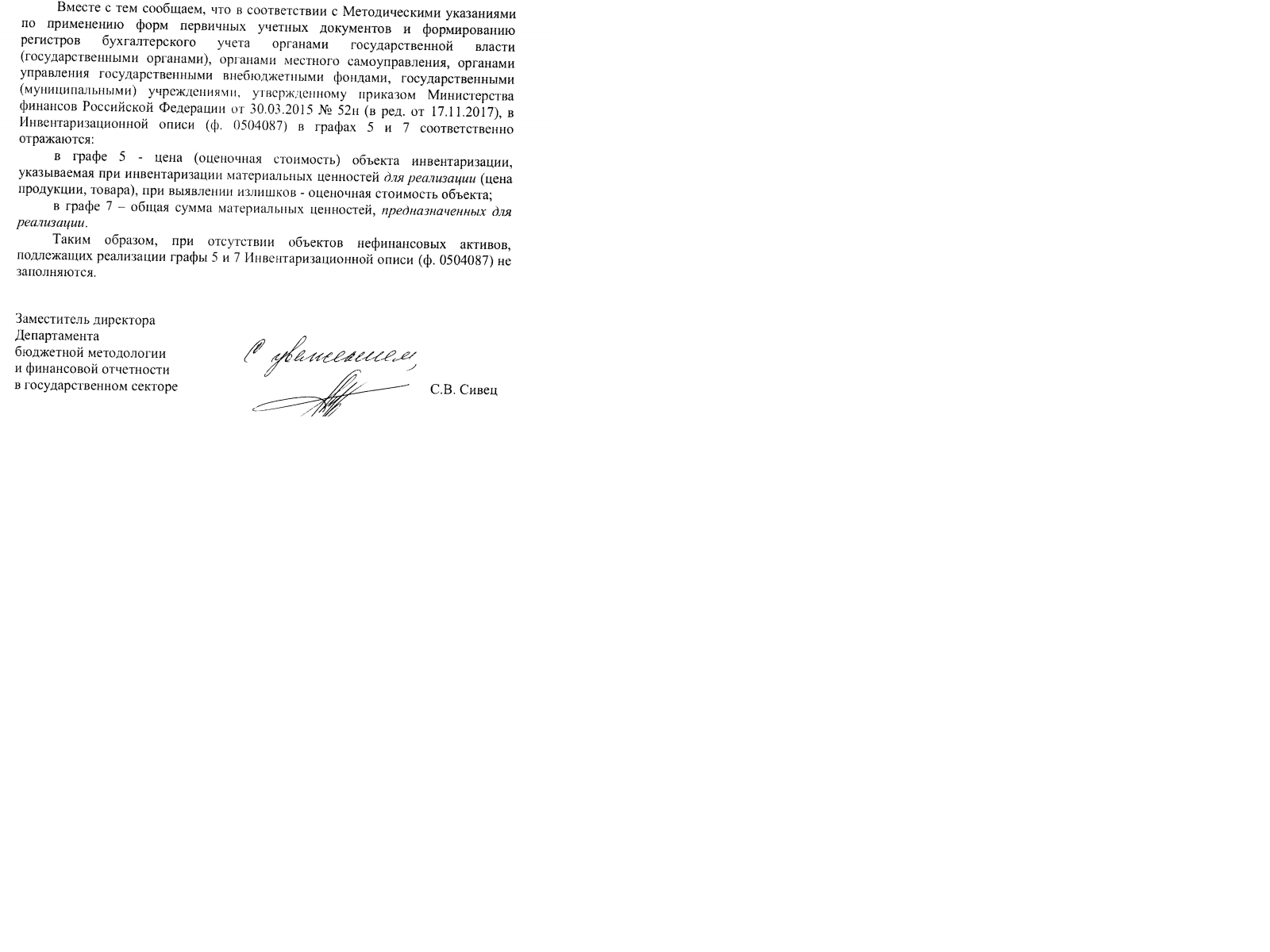 Добрый вечер. Я написала письмо в Министерство финансов по вопросу заполнения этих граф 5 и 7 вот вопрос: Нужно ли заполнять графы 5, 7 в Инвентаризационной описи (ф. 0504087), если материальные ценности, числящиеся в учреждении, не предназначены для реализации?