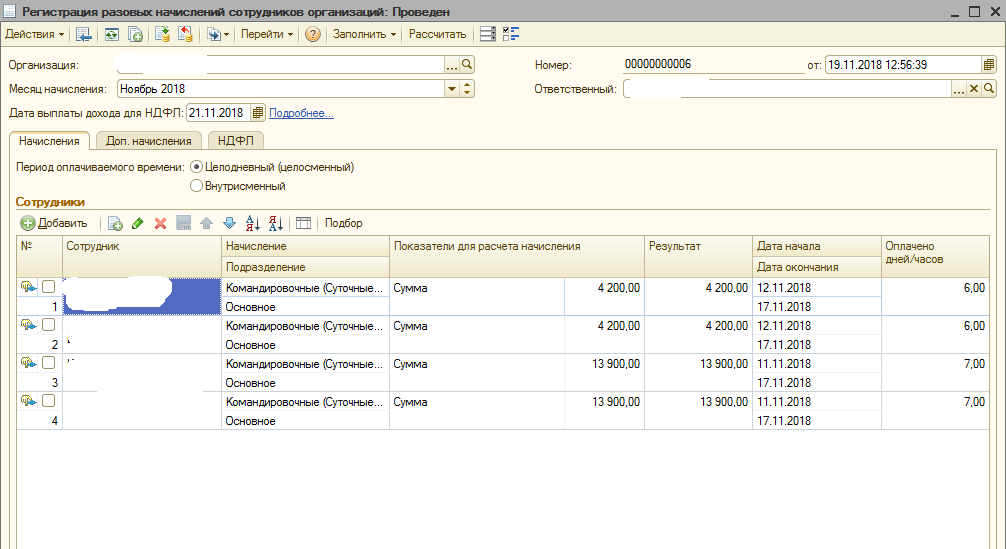 Документом "Регистрация разовых начислений сотрудникам" я отражаю начисленные командировочные (чтобы они в РСВ попали как положено)