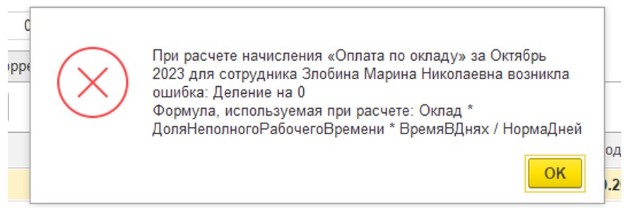 – Иногда при формировании документа «начисление зарплаты и взносов» при расчете начисления «оплата по окладу» может возникнуть такая ошибка как – «Деление на 0».