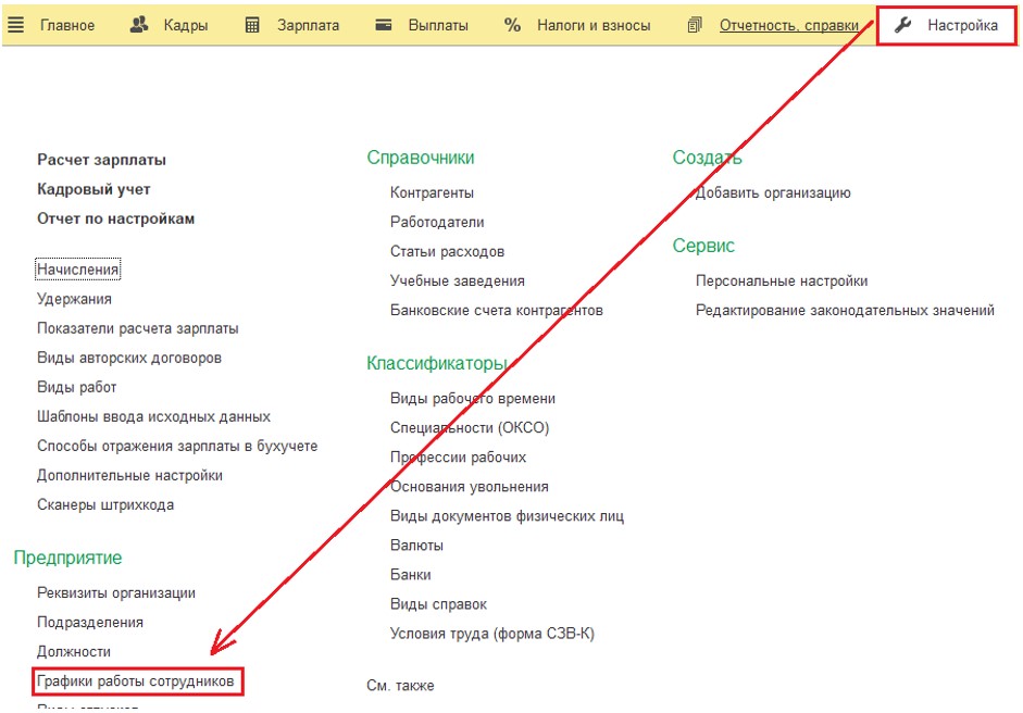 Чтобы его заполнить, необходимо зайти в раздел «Настройка» – «Графики работы сотрудников» и открыть график, по которому работает сотрудник.