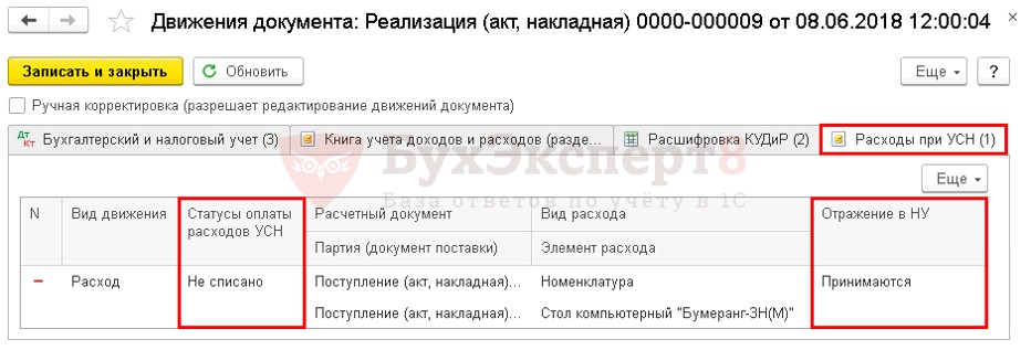 Все эти стадии отражаются в регистре накопления «Расходы УСН», и только после того, как товар пройдет весь путь, будут сделаны движения в регистре Книга учета доходов и расходов (раздел I).