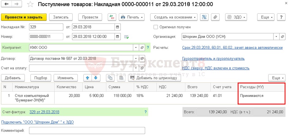 • Отражение в НУ — для отражения в КУДиР должно быть выбрано «Принимаются». Эта информация устанавливается при поступлении товаров, но может быть изменена при их перемещении.