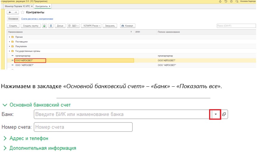 Далее мы создаем новый банк через раздел «Справочники» – «Контрагенты».