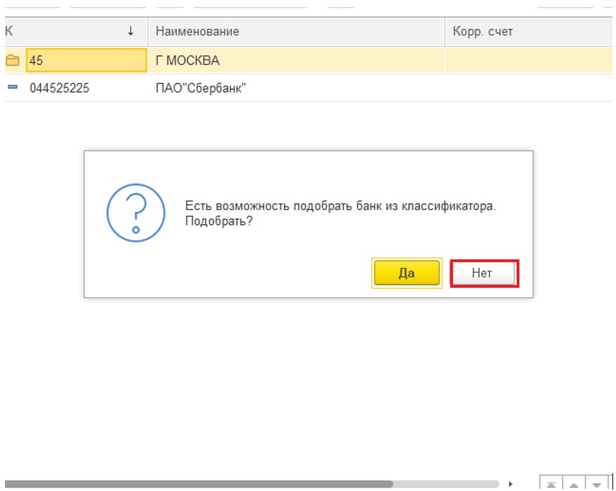 После этого нам дается возможность подобрать банк из классификатора, нажимаем «Нет».