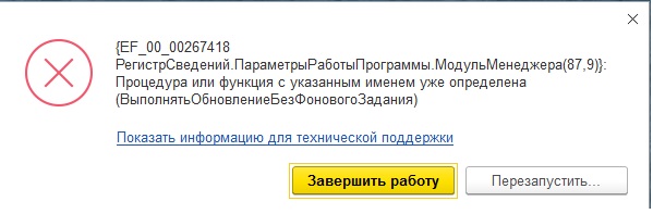 {EF_00_00267418 РегистрСведений.ПараметрыРаботыПрограммы.МодульМен еджера(87,9)}: Процедура или функция с указанным именем уже определена (ВыполнятьОбновлениеБезФоновогоЗадания)