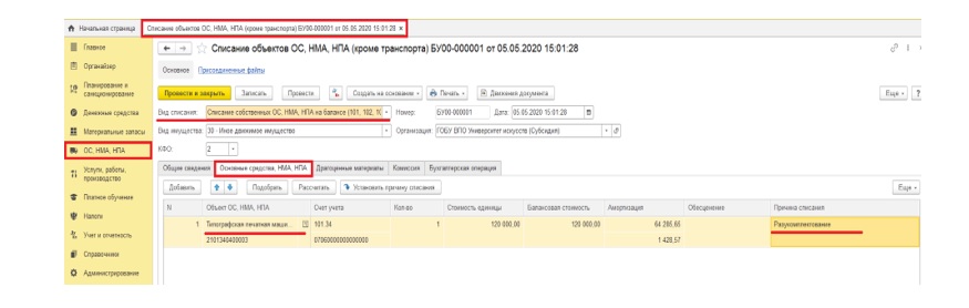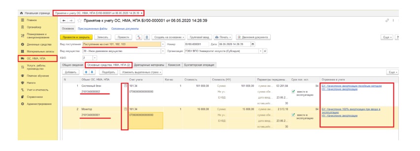 Принятие к учету инвентарных объектов основных средств, полученных в результате разукомплектования, оформляется документом «Принятие к учету ОС, НМА, НПА» (раздел «ОС, НМА, НПА» – команда панели навигации «Принятия к учету ОС, НМА, НПА»). При заполнении документа в реквизите «Вид поступления» выбираем значение «Поступление на счет 101, 102, 103». На закладке «Основные средства, НМА, НПА» вносим список объектов, полученных в результате разукомплектования. Данные о балансовой стоимости объектов, полученных в результате разукомплектования, следует взять из отгрузочных документов. В случае, когда стоимость этих объектов не была выделена в отгрузочных документах поставщика, она должна быть определена комиссией учреждения по поступлению и выбытию нефинансовых активов. Порядок определения стоимости нефинансовых активов, полученных в результате разукомплектования, и суммы начисленной на них амортизации следует закрепить в учетной политике. В документе «Принятие к учету ОС, НМА, НПА» объекты, полученные в результате разукомплектования, стоимостью свыше 100 000 руб. следует ввести как отдельные инвентарные объекты с присвоением индивидуального инвентарного номера, установив для каждого из них порядок начисления амортизации и способ начисления амортизации. Также необходимо указать дату ввода в эксплуатацию по данным разукомплектованного объекта основных средств, при этом оставшийся срок полезного использования заполнится автоматически. Для объектов, стоимостью до 100 000 руб. можно установить признак группового учета с присвоением индивидуальных инвентарных номеров. В данном случае в документ вводится каждый инвентарный номер, с указанием для каждого из них порядка и способа начисления амортизации. Как и при оформлении безвозмездного поступления ОС, дату ввода в эксплуатацию, срок полезного использования и оставшийся срок полезного использования следует указать согласно инвентарной карточке разукомплектованного объекта. Рис. 6 На закладке «Бухгалтерская операция» для формирования проводок в реквизите «Типовая операция» указываем вид операции «Принятие к учету объектов ОС, полученных при разукомплектовании (401.10.172)». По строке «Счет» указываем КПС и проводим документ. Рис. 7 В результате проведения документа формируются бухгалтерские записи по принятию к учету балансовой стоимости и амортизации в корреспонденции со счетом 401.10.172. По объектам, по которым установлен способ начисления амортизации – «100% при вводе в эксплуатацию» формируется дополнительная запись по доначислению амортизации до 100%. Согласно п. 85 Инструкции по применению Единого плана счетов бухгалтерского учета (утв. приказом Минфина РФ от 01.12.2010 №157н), при принятии к учету объекта основного средства, нематериального актива по балансовой стоимости с ранее начисленной суммой амортизации, расчет учреждением годовой суммы амортизации производится линейным способом, исходя из остаточной стоимости амортизируемого объекта на дату его принятия к учету, и нормой амортизации, исчисленной исходя из оставшегося срока полезного использования на дату его принятия к учету. Из документа можно сформировать «Бухгалтерскую справку (ф. 0504833)» и/или «Приходный ордер на приемку материальных ценностей (нефинансовых активов) (ф. 0504207)». Рис. 8 |