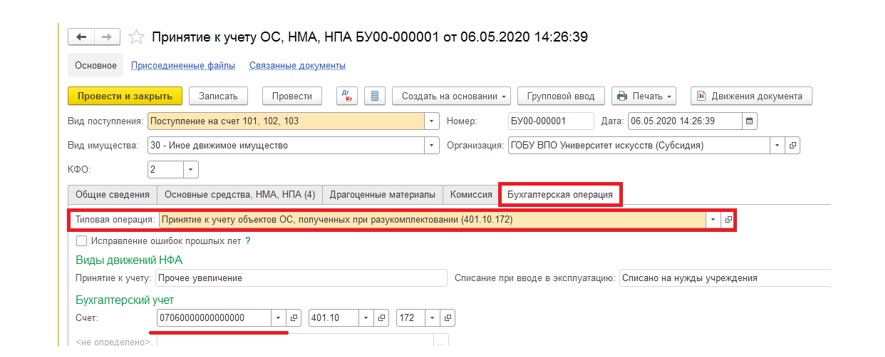 Принятие к учету инвентарных объектов в результате разукомплектования