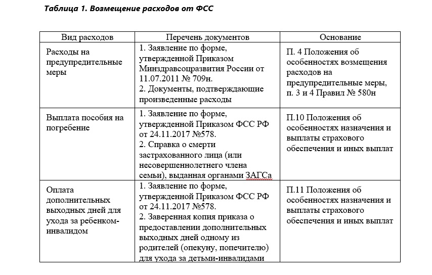 Наряду с этим расходы на предупредительные меры, выплату пособия на погребение и оплату дополнительных выходных дней для ухода за детьми-инвалидами работодатель осуществляет за счет собственных средств с их последующим возмещением из бюджета ФСС.