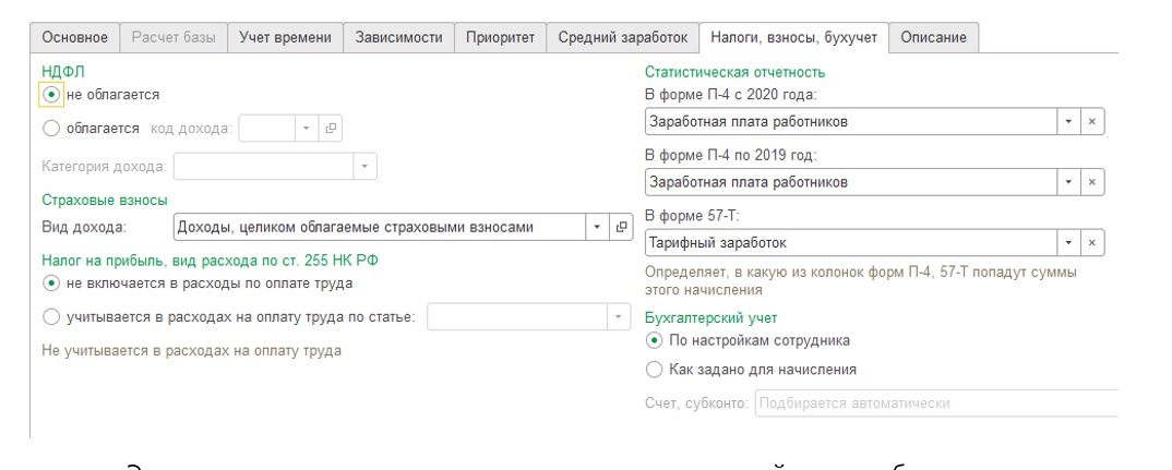 Для корректного учета доходов физических лиц для целей исчисления страховых взносов и для дальнейшего заполнения показателей расчета базы для начисления страховых взносов в РСВ следует уточнить настройки начислений (раздел «Настройка» – «Начисления»). На вкладке «Налоги, взносы, бухучет» по строке «Страховые взносы» проверяем и при необходимости уточняем вид дохода для исчисления страховых взносов.