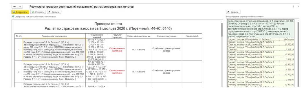 Первое, с чего следует начать анализ заполненных сумм в отчете – это выполнить проверку контрольных соотношений формы. Для этого следует нажать кнопку «Проверка» – «Проверить контрольные соотношения». После выводится результат проверки контрольных соотношений (далее – КС) показателей.