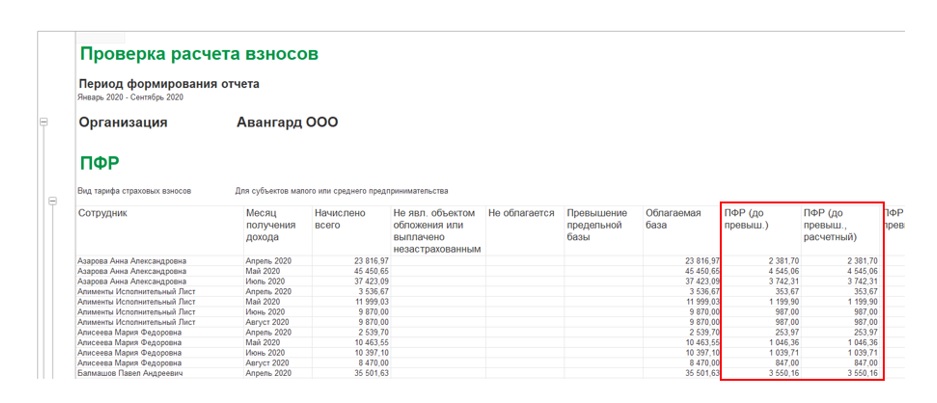 Отчет формирует информацию о суммах взносов в разрезе месяцев, сотрудников и видов страховых взносов. Обратите внимание на столбцы ПФР (до превыш.) и ПФР (до превыш. расчетного), ФОМС и ФОМС (расчетный), ФСС и ФСС (расчетный) – именно они позволяют выявить ошибку в расчете взносов.