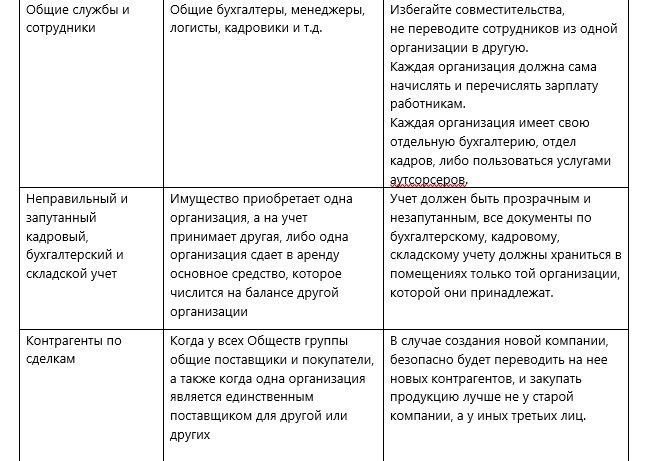 Рекомендации по законному дроблению бизнеса для наглядности указаны в таблице.