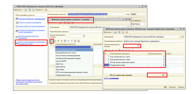 Согласно приказу Минфина РФ от 30.12.2008 №148н, единицей бюджетного учета основных средств является инвентарных объект. Каждому приобретенному вследствие покупки, безвозмездной передачи инвентарному объекту стоимостью более 3000 руб. включительно, а также библиотечному фонду, драгоценностям и ювелирным изделиям, присваивается уникальный инвентарный номер. В программе «1С:Бухгалтерия государственного учреждения 8»,ред.1.0. в карточке учреждения имеется шаблон формирования инвентарных номеров.