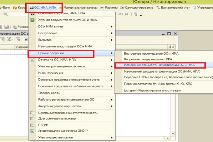 • Изменение стоимости, амортизации ОС и НМА (меню «ОС, НМА, НПА» – «Прочие операции»), где имеется несколько видов операций: изменение амортизации (109, 401.20 – 104); изменение стоимости (101, 102 – 106, 401.10), амортизации (109, 401.20 – 104); изменение стоимости (401.20 – 101, 102), амортизации (104 – 101, 102); изменение стоимости (401.20 – 101, 102), амортизации (104 – 401.20); изменение стоимости НПА (меню «ОС, НМА, НПА» – «Учет непроизводственных активов»).