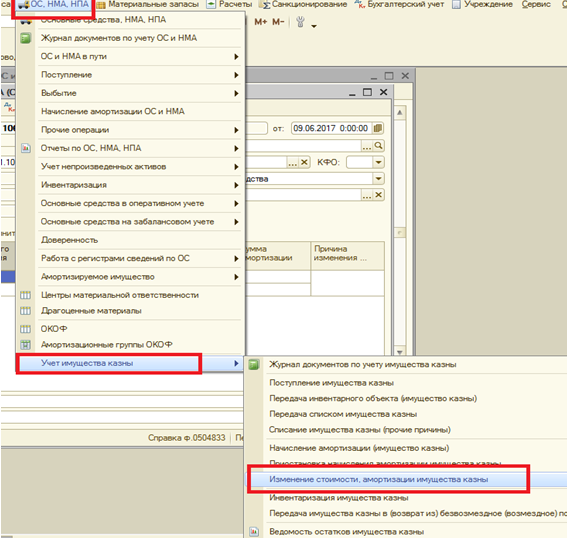 • Изменение стоимости, амортизации имущества казны (меню «ОС, НМА, НПА» –«Учет имущества казны») с операциями: изменение амортизации (109, 401.20 – 104); изменение стоимости (108 – 106, 401.10), амортизации (109, 401.20 – 104); изменение стоимости (401.20 – 108), амортизации (104 – 108); изменение стоимости (401.20 – 108), амортизации (104 – 401.20).