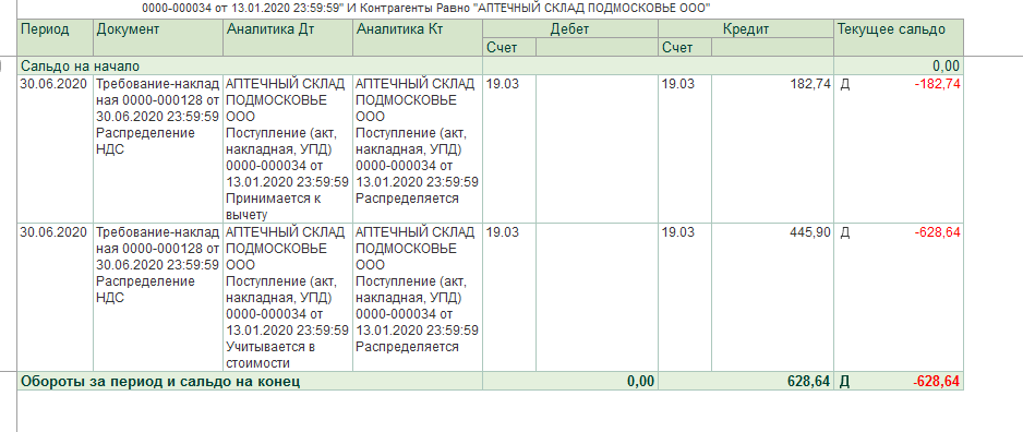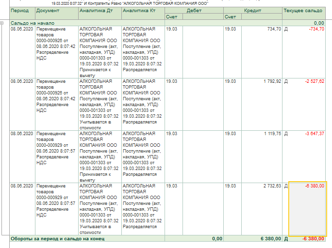 В течение года мы делаем требования, перемещения, поступления, где нужно указывать способ распределения, в конце квартала я делаю распределение ндс специальным документом "Распределение НДС", после чего формирую "формирование записей книги покупок", и после всех данных манипуляция на счете 19 появляются отрицательные сальдо, "проваливаясь" в карточку учета, вижу то, что на фото, которые я приложила. Почему появляются минусы именно по этим документам, не понятно.